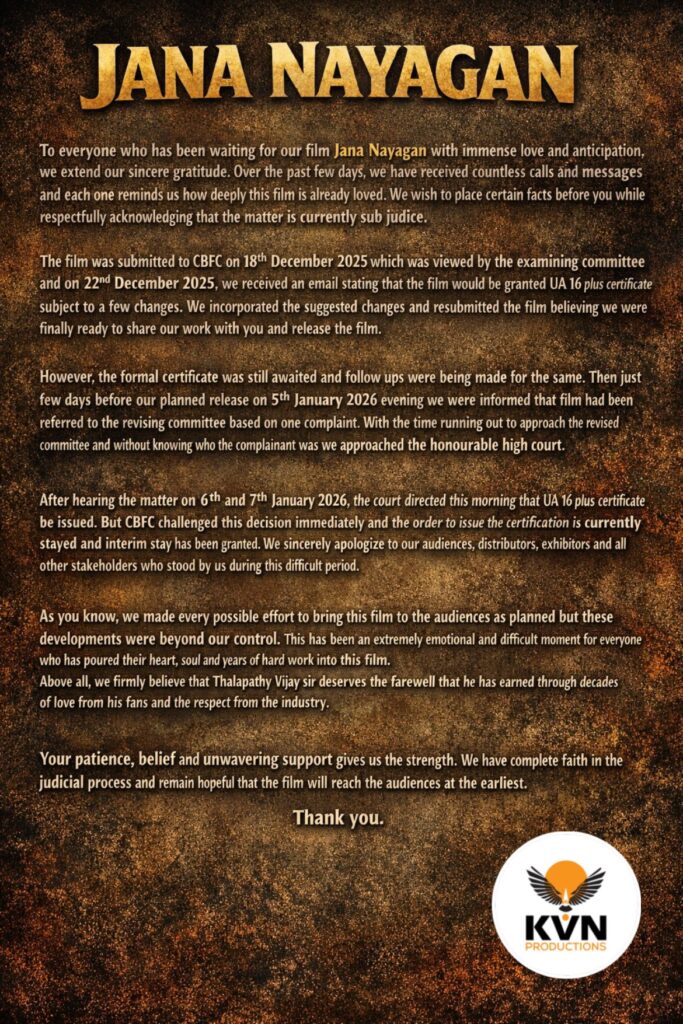 KVN Productions has issued an official and detailed statement clarifying the sequence of events surrounding the censor delay faced by Jana Nayagan, Thalapathy Vijay’s much-anticipated film. The clarification comes amid growing speculation and confusion over the film’s sudden postponement just days before its scheduled release.