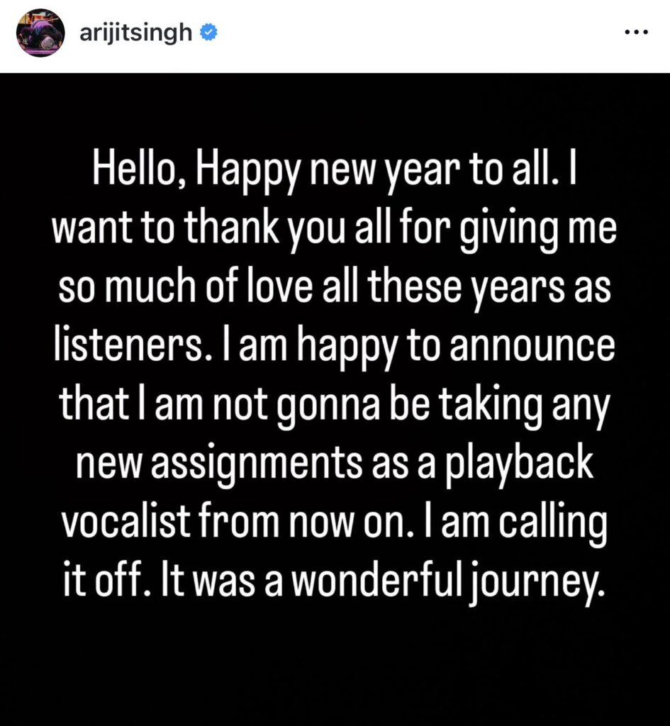 The announcement came on Tuesday, January 27, 2026, when Arijit shared an emotional message on his social media, confirming that he will no longer take on new assignments as a playback vocalist for Bollywood films. In his heartfelt note, the singer wrote, “Hello, Happy new year to all. I want to thank you all for giving me so much love all these years as listeners … I am calling it off. It was a wonderful journey.”