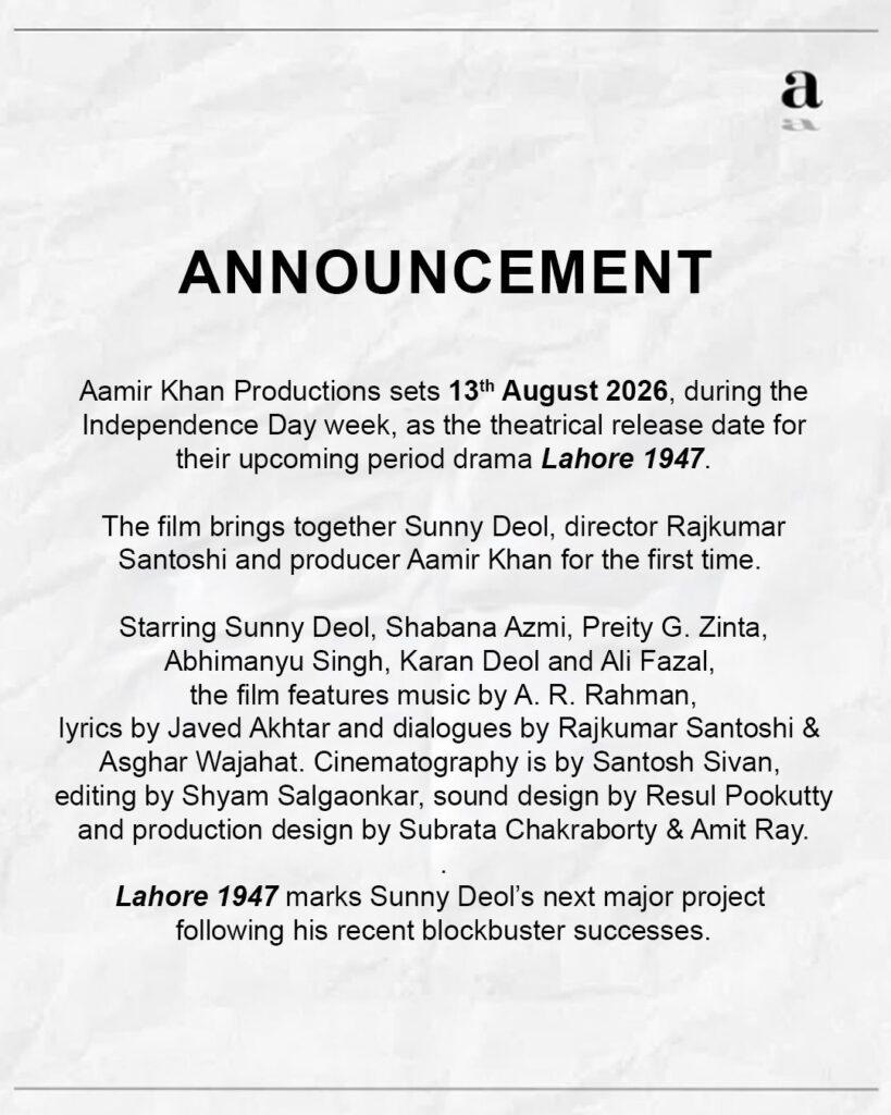 Lahore 1947 is not just another period film; it aims to revisit history through personal stories and emotional narratives. If executed well, the film could become a landmark in Sunny Deol’s career and a prestigious addition to Aamir Khan Productions’ filmography. With nostalgia, patriotism, and emotional storytelling at its core, the movie is already generating immense anticipation among audiences across India.