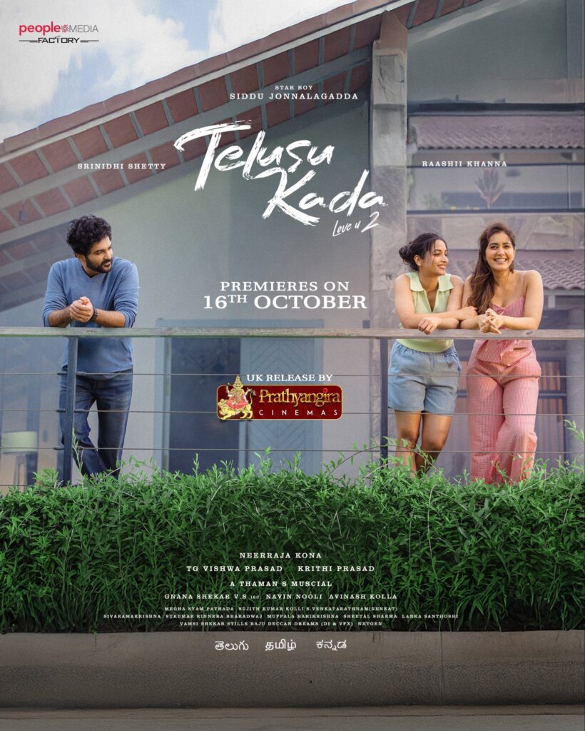 The much-awaited romantic entertainer Telusu Kada, starring Siddhu Jonnalagadda, Raashi Khanna, and Srinidhi Shetty in the lead roles, is all set to hit the big screens on October 17th. Directed by Neeraj Kona, the film has already created a decent buzz among audiences with its refreshing premise and vibrant star cast.Backed by People Media Factory, Telusu Kada promises to be a fun-filled romantic triangle packed with emotions, humor, and heartwarming moments.